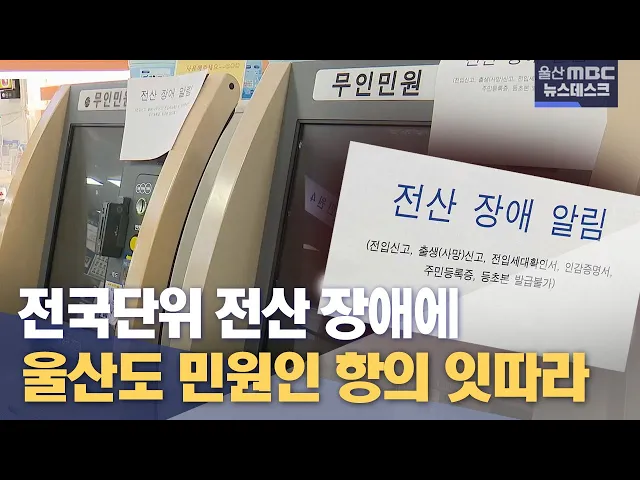 ◀ 앵 커 ▶오늘(11/17) 전국의 행정복지센터 전산망이 마비되면서 울산에서도 시민들이 큰 불편을 겪었습니다.주민등록, 인감 등 주요 생활 민원 서류 발급이 지연되면서 주민들이 큰 불편과 혼란을 겪었습니다.이용주 기자.[기자]울산 남구의 한 주민센터 곳곳에 오전부터 전산 장애를 알리는 안내문이 붙어있습니다.국가정...