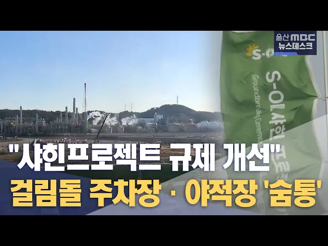 [앵커]에쓰오일이 9조 3천억원의 사업비를 투입해 대규모 석유화학시설을 짓는다는 샤힌프로젝트 소식 올해 초 전해드렸는데요.근로자를 위한 주차장과 야적장 확보가 어렵다는 지적이 현장에서 제기되면서 울산시가 정부를 설득해 관련 규제를 개선하기로 했습니다.이용주 기자.[리포트]에쓰오일의 샤힌프로젝트 공사현장....