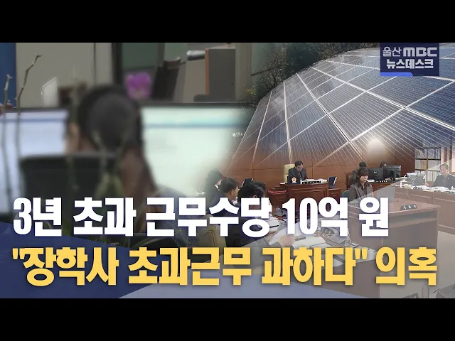 [앵커]울산교육청에 근무하는 장학사들이 3년 동안 받은 초과근무 수당이 10억 원을 넘어, 울산시의회가 과다 수령 의혹을 제기했습니다. 또 교육청이 설치 예산을 지원한 태양광 설비의 적자 운영이 심각한 것으로 나타났습니다. 홍상순 기잡니다.[리포트]울산시교육청과 강남·강북교육청에 근무하는 교육전문직은 160명. ...