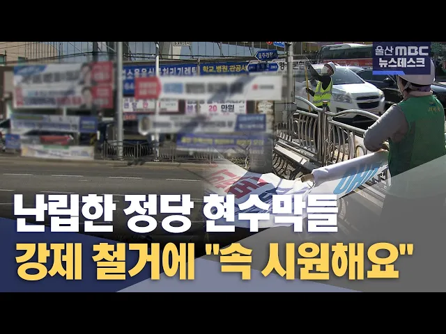 ◀ 앵 커 ▶길가에 무질서하게 걸린 정당 현수막 때문에 시민 불편이 많았는데, 울산시가 정당 현수막 철거를 위한 조례를 만들고 오늘부터 철거에 들어갔습니다. 이다은 기자. ◀ 리포트 ▶울산의 한 교차로. 정당 현수막이 낮은 곳부터 층층이 걸려 있습니다. 현수막에 가려 가게 간판이 잘 보이지 않습니다. 공무원들이 막대...