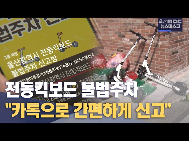 [앵커]길을 가다가 아무렇게나 방치된 전동 킥보드 때문에 불편함을 느낀 적이 있으실 텐데요.지자체가 이같은 전동 킥보드 불법 주차 신고를 쉽게 할 수 있도록 오픈 채팅방을 개설해 운영하고 있습니다. 이다은 기자입니다.[리포트]울산 북구의 횡단보도 앞.점자 블록 위에 전동 킥보드가 덩그러니 놓여있습니다.그런가하...