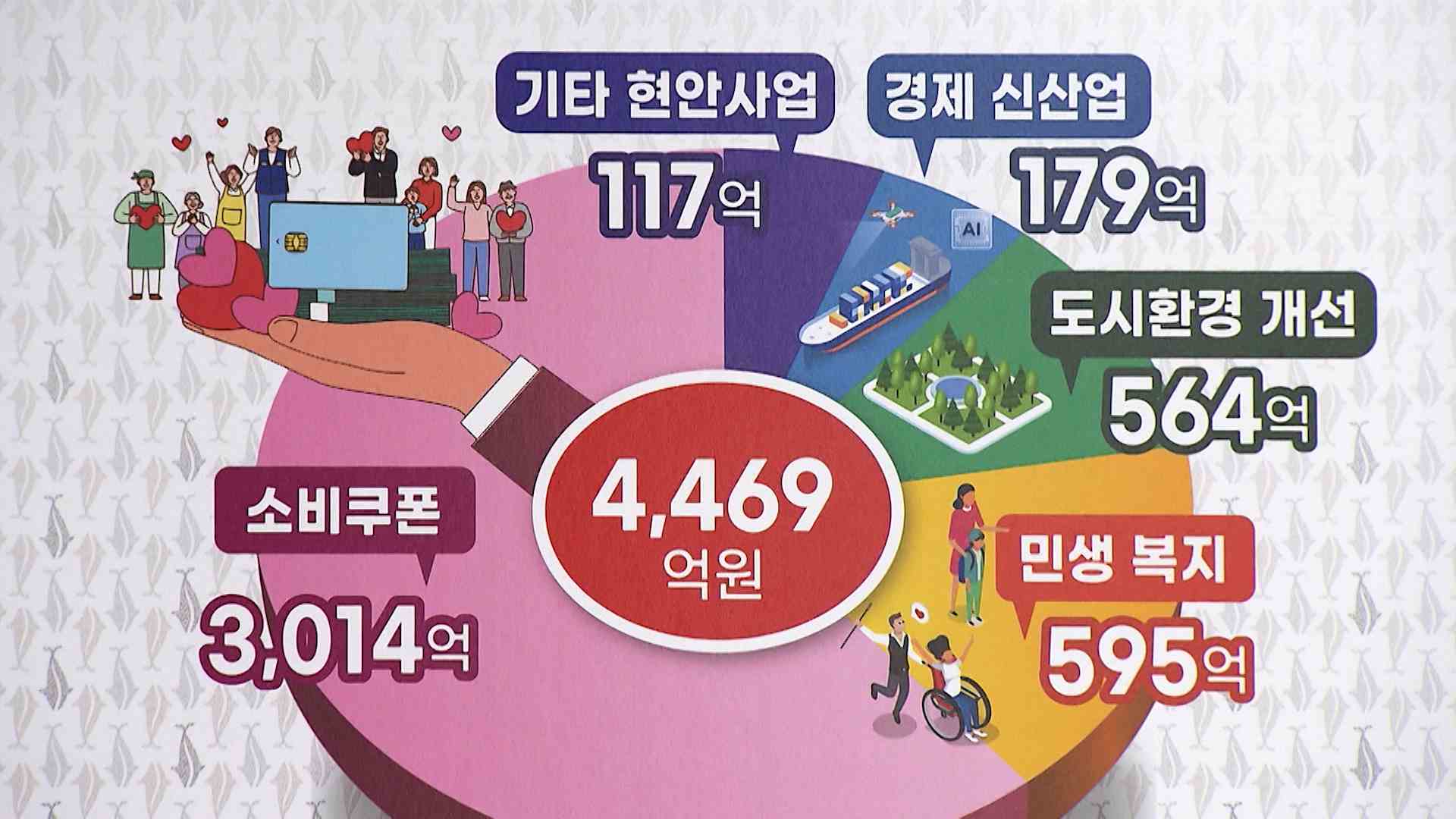 울산시가 시민 생활 중심의 현안사업 추진을 위해 올해 2차 추가경정예산으로 4천469억 원을 편성습니다. 울산시는 민생 회복 소비쿠폰 2차 발행에 3천억 원, 시립 아이돌봄센터 등 복지 분야에 595억 원, 도시 환경 개선에 564억 원 등 생활 밀착형 사업 중심의 예산을 편성했다고 설명했습니다. 2차 추경 예산 편성으로 ...