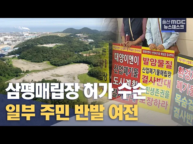 ◀ 앵 커 ▶울산지역 산업폐기물 매립장이 포화상태에 달한 가운데 울주군 온산 삼평매립장 허가가임박한 것으로 알려졌습니다.울주군이 도시계획 자문회의를 마치고 조만간울산시에 입안 결정 신청을 할 예정인데,일부 주민들의 반발을 어떻게 무마할 지가관건으로 남아 있습니다.이상욱 기자가 보도합니다.◀ 리포트 ▶산업폐...