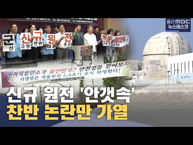 [앵 커]이재명 대통령의 '에너지 믹스' 방침에도 아직 새 정부의 원전 정책은 공식적으로 나오지 않고 있습니다. 이렇게 신규 원전 정책이 아직 불투명하지만 지역에서는 원전 유치 찬반 논란이 가열되고 있습니다. 이다은 기자입니다. [리포트] "신규 원전 말고 울주군민 안전 보장하라! 안전 보장하라!" 울주군 지역 7개 ...