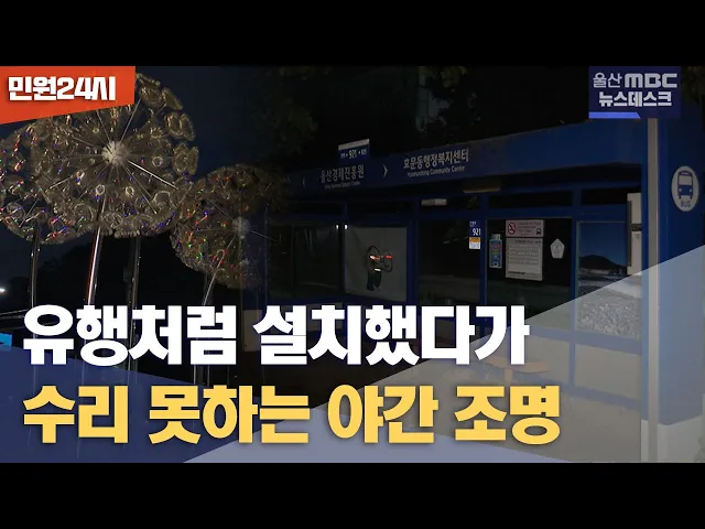 [앵커] 울산의 태양광 버스정류장과 랜드마크 조명시설이 고장이 난 상태로 방치되고 있습니다. 설치 당시, 친환경 또는 신소재라는 이유로 유행처럼 설치했다가 지금은 고가의 부품 비용을 감당하기 못해 이러지도 저러지도 못하는 상황입니다. 이다은 기자가 취재했습니다. [리포트] 울산 북구의 한 버스 정류장. 밤 8시...