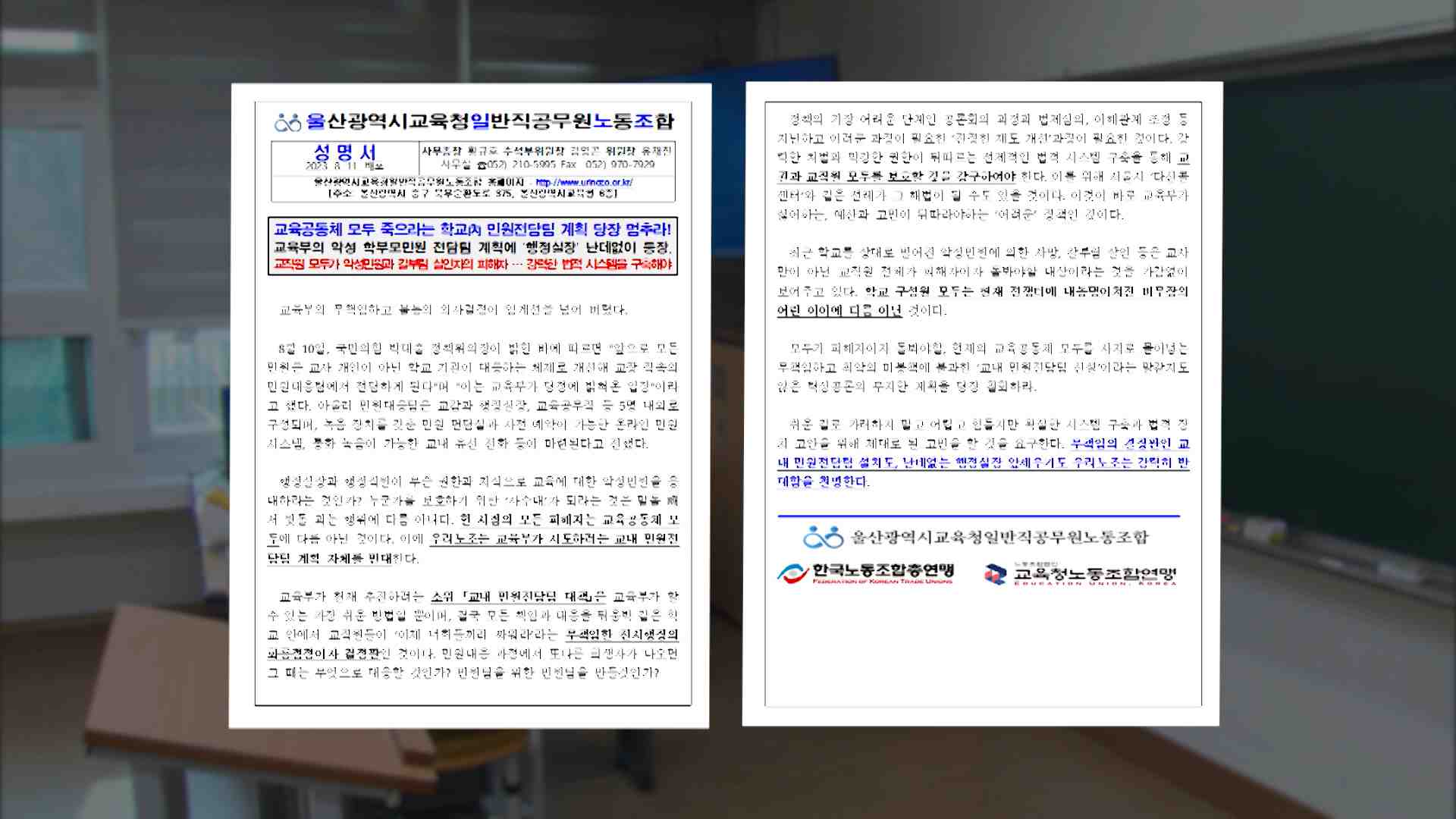 울산시교육청일반직공무원노동조합은 성명서를 내고 교육부가 교권침해에 대한 대책으로 내놓은 '학교 내 민원대응팀' 설치를 반대한다며 계획을 철회하라고 주장했습니다. 이들은 행정실장과 행정 직원이 무슨 권한과 지식으로 교육에 대한 악성 민원을 응대할 수 있냐며 누군가를 지키기 위해 또 다른 희생자를 만드는 무...