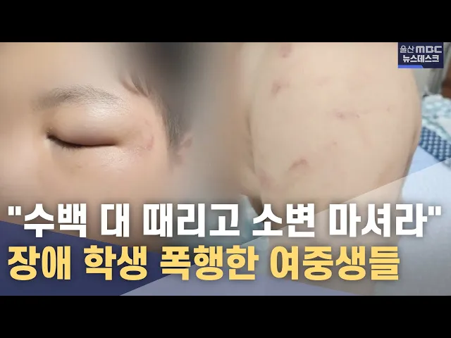 ◀앵커▶ 울산의 한 바닷가 마을에서 여중생 3명이 장애가 있는 남학생을 수백차례 때리고 심지어 자신의 소변까지 먹게 시키는 일이 벌어졌습니다. 이들이 장애 학생을 때린 이유는 여학생 한명에 대한 안좋은 소문을 다른 사람에게 전달했다는 거였습니다. 정인곤 기자 ◀ 리포트 ▶ 눈 부위가 퍼렇게 멍이 든 채 퉁퉁 부었습...