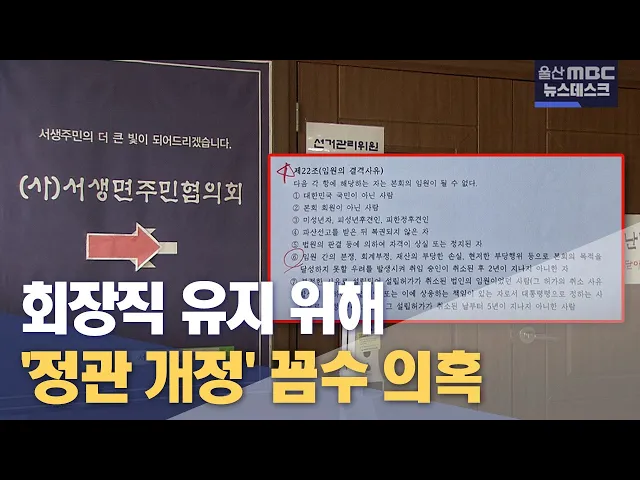 [앵커] 마을 공금 횡령으로 최근 2심에서 징역형을 선고받은 서생면주민협의회 회장이 회장직 유지를 위해 정관 개정을 추진하고 있다는 의혹을 받고 있습니다. 회원 상당수는 자진 사퇴해야 할 회장이 꼼수를 부리고 있다며 질타하고 있는데요. 당사자인 회장은 취재진에게 명확한 해명을 내놓지 않고 있습니다. 홍상순 기...