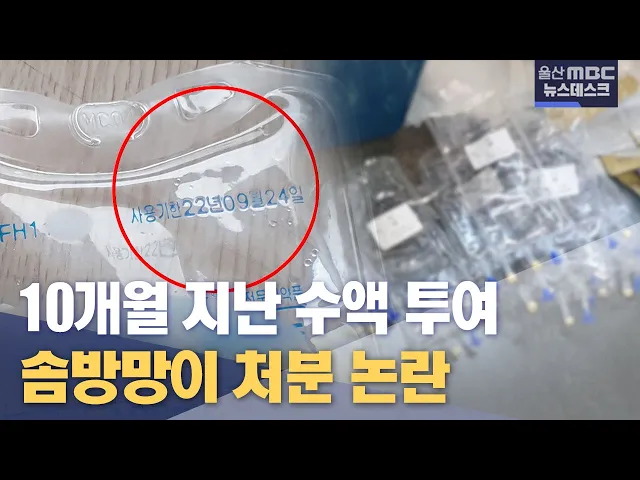 [앵커] 울산의 한 개인병원에서 사용 기한이 10개월이나 지난 수액을 환자에게 투여해 보건당국이 조사를 벌였습니다. 이처럼 사용 기한이 지난 수액 팩은 병원 쓰레기통에서 또 발견됐는데요. 환자 가족들은 이 병원에 솜방망이 행정처분이 내려졌다며 반발하고 있습니다. 이다은 기자가 보도합니다 [리포트] 밤새 고열에 ...