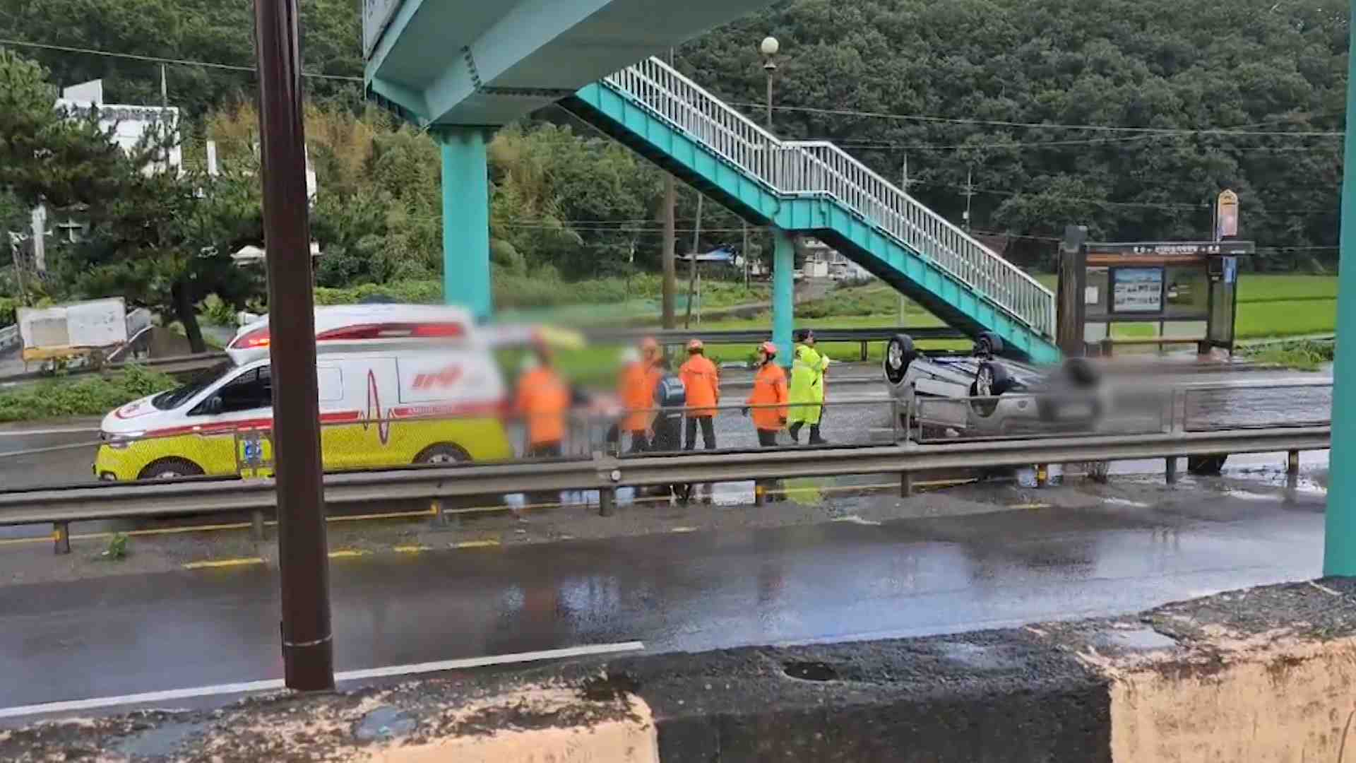 오늘(7/24) 오후 3시 5분쯤 울주군 웅촌면의 한 도로를 달리던 승용차가 뒤집히는 사고가 발생해 50대 운전자가 부상을 입고 병원으로 이송됐습니다. 경찰은 빗길을 달리던 차량이 운전부주의 등으로 미끄러지며 뒤집힌 것으로 보고 정확한 사고 경위를 조사하고 있습니다.//