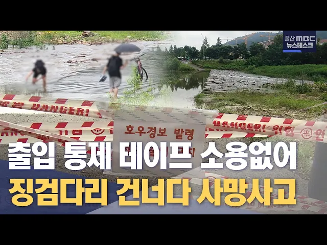 [앵커] 어제(7/17) 울산 척과천에서 징검다리를 건너던 60대 여성이 급류에 쓸려 숨지는 사고가 발생했습니다. 당시 징검다리 앞에는 차단봉이 내려가 있고 출입을 금지했지만 소용이 없었습니다. 이다은 기자가 사고 현장을 다녀왔습니다. [리포트]며칠째 비가 내렸다 그치기를 반복하며 불어난 척과천. 고등학교와 아파트...