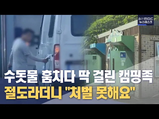 [앵커] 여름철을 맞아 늘어난 캠핑족들 중 일부가 공용 수돗물을 무단으로 이용한다는 내용 얼마 전에 보도해 드렸는데요. 이를 목격한 시민이 신고를 했지만 처벌이 어렵다는 답변을 받았습니다. 무슨 이유 때문인지, 이다은 기자가 알아봤습니다. [리포트] 울산 북구 해변가에 있는 공영주차장. 공중 화장실 건물 앞에 캠...