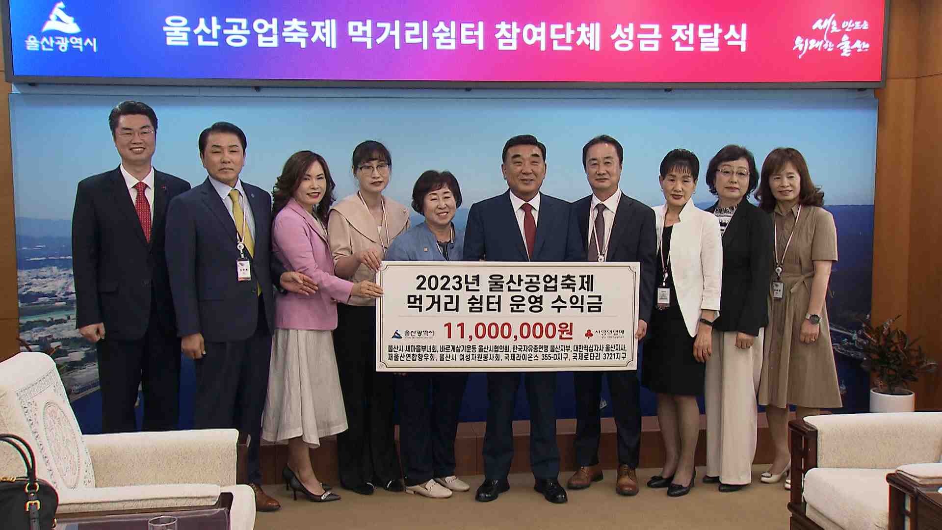 이달초 열린 공업축제에서 먹거리 쉼터를 운영했던 비영리민간단체가 울산사회복지공동모금회에 성금을 전달했습니다. 새마을부녀회 등 8개 단체는 먹거리 쉼터를 운영하면서 번 수익금 천100만원을 어려운 이웃을 위해 써달라고 밝혔습니다. 전달된 성금은 어려운 이웃을 위한 쌀·난방유 지원, 취약계층 주거환경 개선 등...