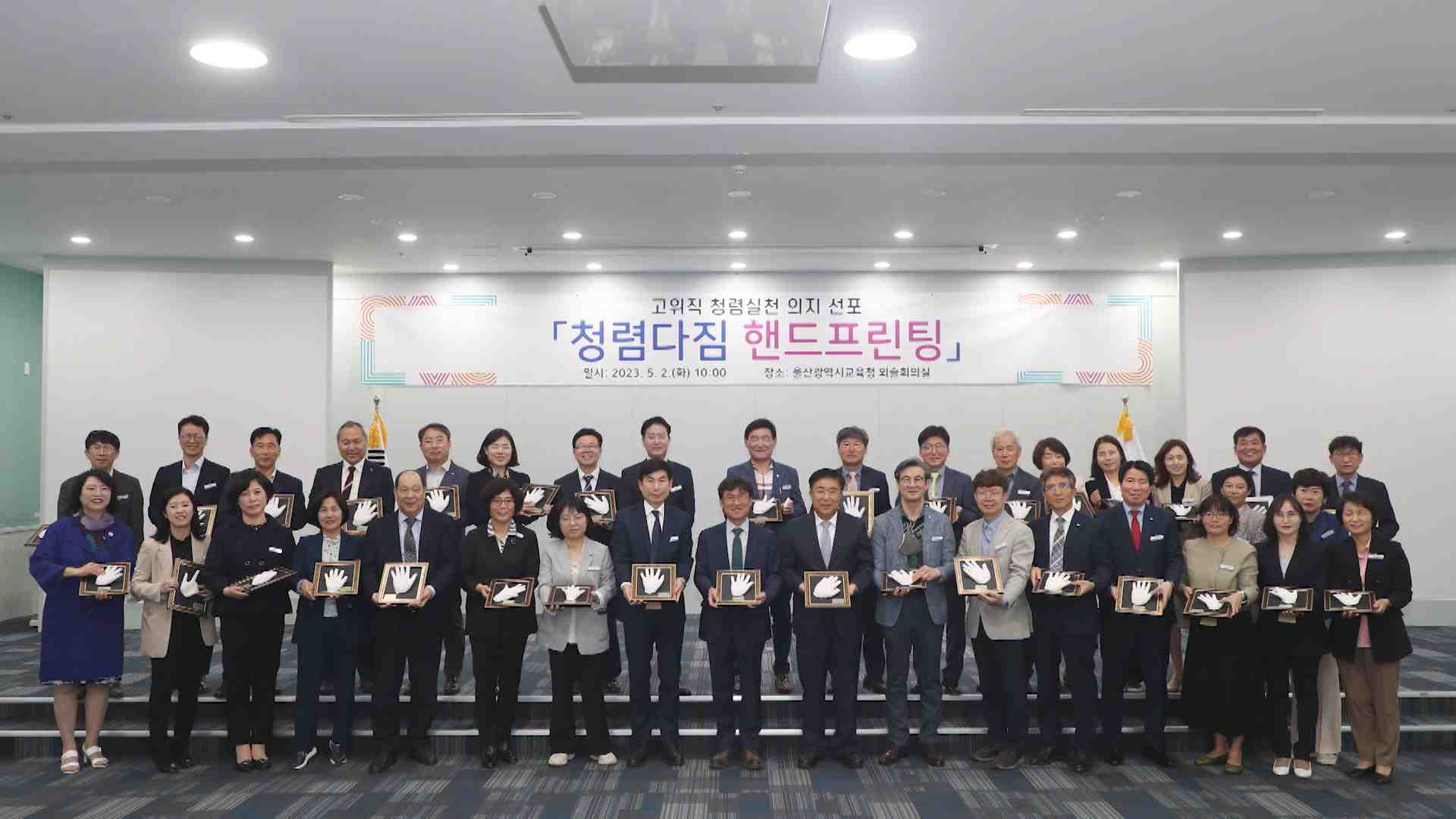 울산시교육청은 고위공직자 청렴 실천을 위해 오늘(5/2) '청렴 다짐 기념 핸드 프린팅' 행사를 열었습니다. 이번 행사에는 청렴대책추진단장인 천창수 교육감을 비롯해 간부 공무원 40명이 참석했으며, 간부 공무원들은 청렴 각오를 다지고, 별도 청렴서약서도 작성했습니다. 시교육청은 올해 '청렴한 울산교육'을 비전으로...