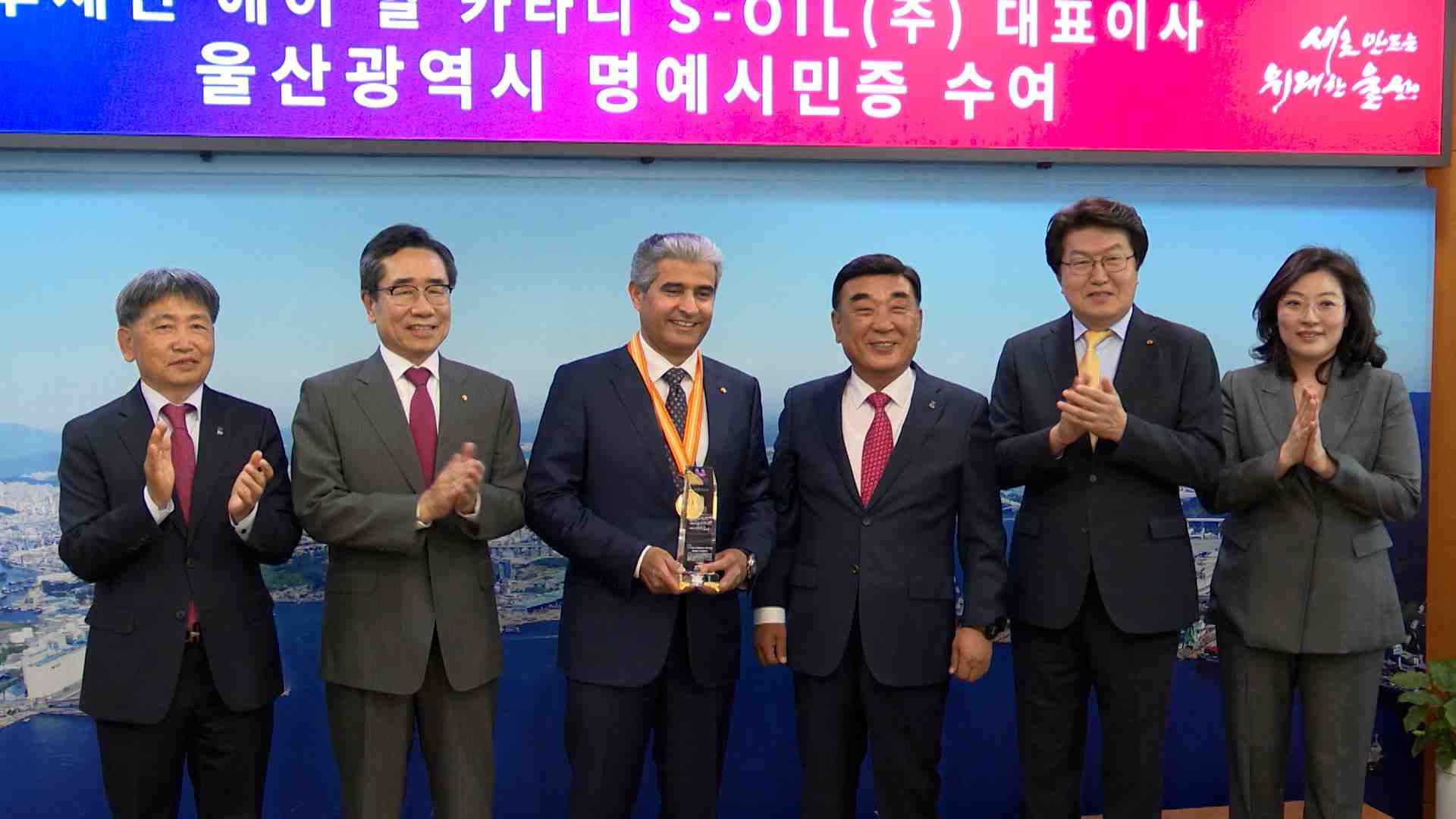 울산시는 오늘(4/26) 후세인 에이 알 카타니 에쓰오일 대표이사에게 명예시민증과 기념 메달을 수여했습니다. 알 카타니 이사는 지난 2019년부터 다양한 사회공헌 활동을 펼치고, 대규모 시설투자를 통해 지역 석유화학산업 발전에 기여한 공로를 인정받았습니다. 명예시민은 울산 발전에 공로가 큰 외국인과 해외교포, 타 ...
