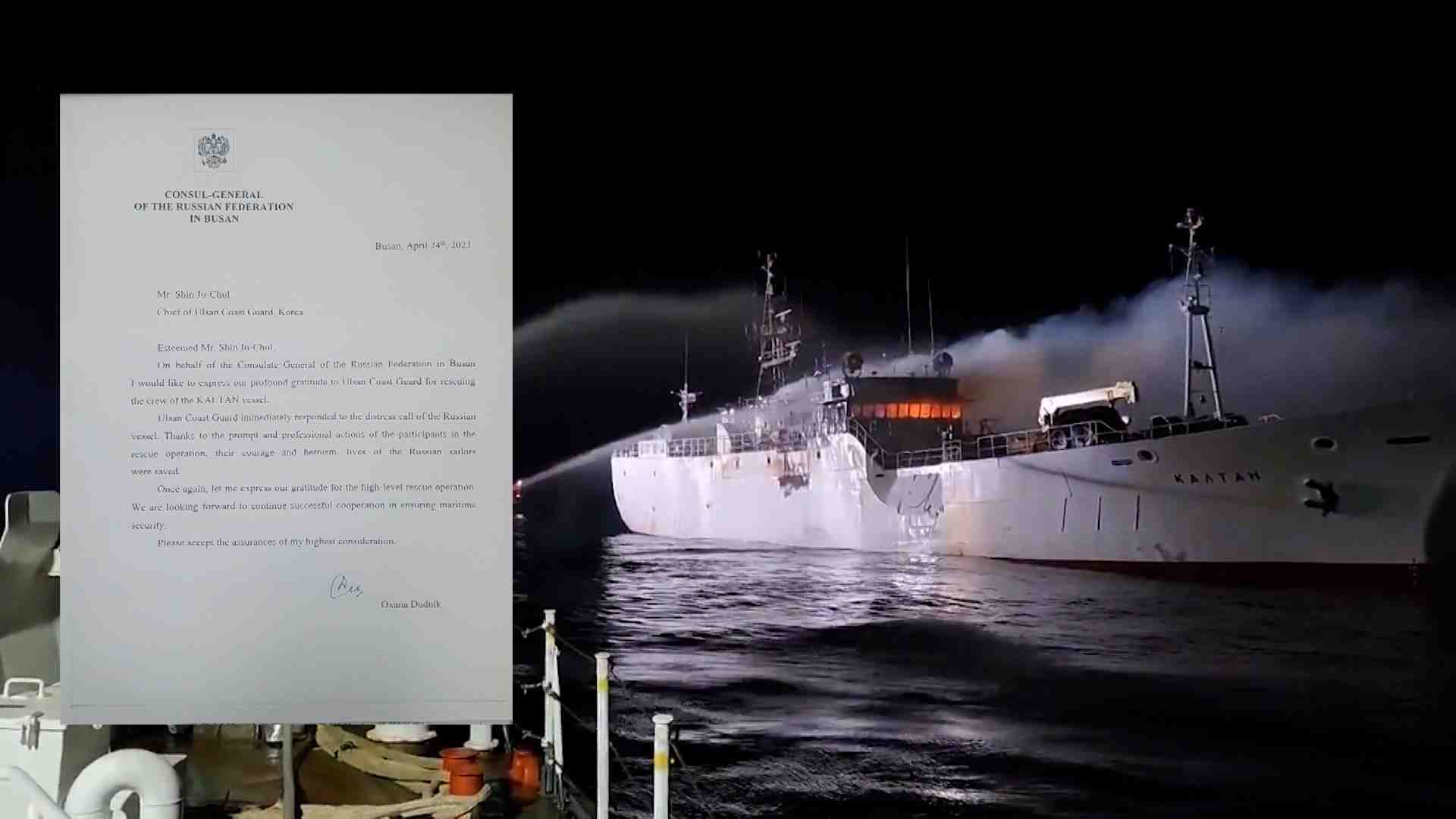 주 부산 러시아 총영사관이 지난 24일 발생한 러시아 어선 화재 진압에 앞장선 울산해양경찰서에 감사 서한문을 보내왔습니다. 주 부산 러시아 총영사 옥사나 두드니쿠 는 신속하고 전문적인 조치와 영웅 정신 덕분에 러시아 선원들의 생명을 구할 수 있었다며 감사 인사를 전했습니다.