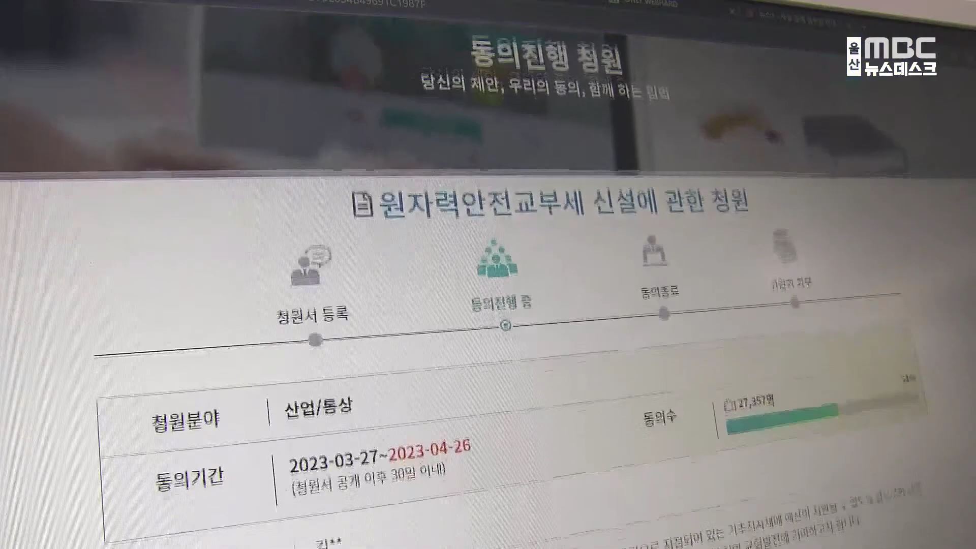 원전 인근 지자체에 원자력안전교부세를 주도록 하는 '지방교부세법 개정안 입법' 국민동의 청원 참여 인원이 청원 기준의 50%, 2만 5천명을 넘었습니다. 이번 청원은 오는 26일까지 5만 명 이상 동의를 얻을 경우 국회 소관 상임위원회에 회부되고 심사에서 채택될 경우 국회 본회의에 상정됩니다. 개정안은 방사선 비상계...