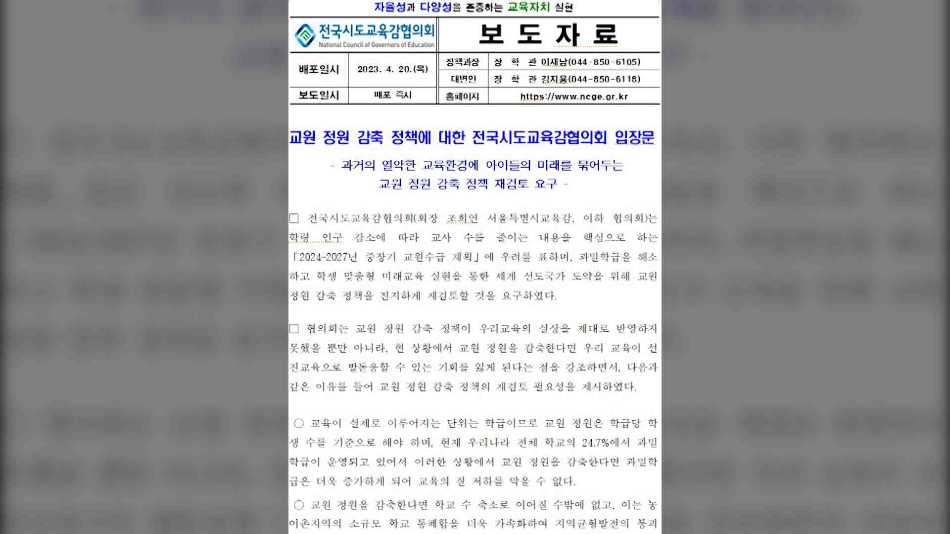 전국시도교육감협의회는 오늘(4/20) 입장문을 내고 교원 정원 감축을 재검토하라고 요구했습니다. 협의회는 교사 정원이 감축되면 고교학점제 도입과 과밀학급 해소가 힘들어 교육의 질이 떨어지고 지역소멸이 가속화될 것이라며 우려를 표했습니다. 최근 정부는 학령 인구 감소를 고려해 교원 감축을 핵심 내용으로 하는 '...