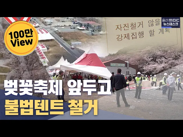 [앵커]3년 만에 열리는 작천정 벚꽃축제를 이틀 앞두고 울산 울주군이 노점을 위해 설치된 불법 시설물을 철거하는 행정대집행을 벌였습니다. 울주군은 불법시설물 재설치를 시도하는 상인들을 막기 위해 축제기간이 끝날 때까지 감시인력을 투입할 계획입니다. 이용주 기자입니다. [리포트]왕벚나무 220여 그루가 길이 1㎞...
