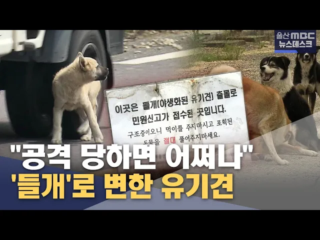 [앵 커] 울산 곳곳에서 무리를 지어 몰려다니는 들개들이 나타나고 있습니다. 야생화된 유기견들이 다시 번식을 하면서 잡아도 잡아도 수가 줄지 않고 있는 건데요. 주민들은 들개 위협을 피하기 위해 마을을 다닐 때도 보호도구를 들고 나서고 있습니다. 이용주 기자. [리포트] 영남알프스를 찾는 등산객들의 주요 진입로 ...