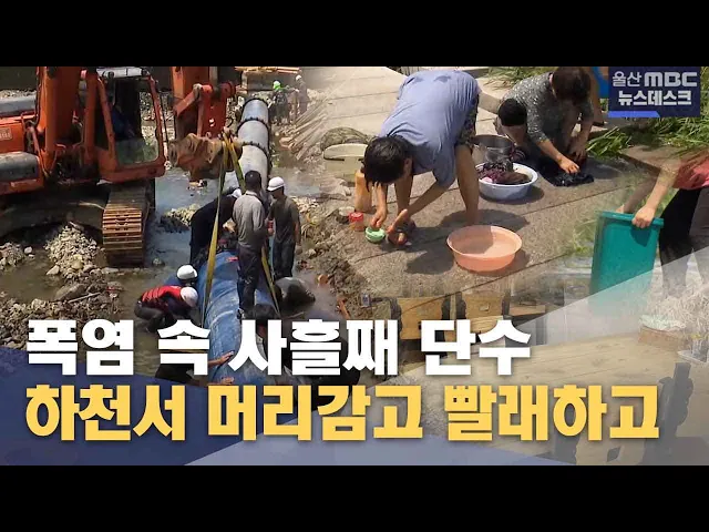 [앵 커]울산에서는 집중호우로 상수도관이 파손되면서 수돗물 공급이 사흘째 중단됐습니다. 지자체가 급수차를 동원하고 생수를 나눠주고 있지만 찌는듯한 더위에 당장 쓸 물은 부족하기만 한데요. 급기야 주민들이 인근 하천에 나와서 머리를 감고 빨래를 하고, 물을 길어다 쓰고 있습니다. 정인곤 기자 [리포트] 폭우로 ...