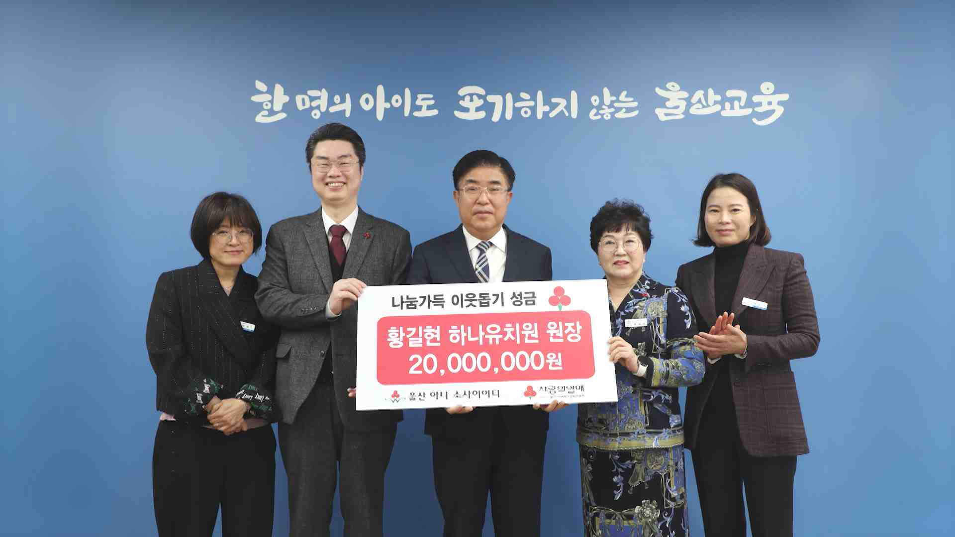 울산 동구 하나유치원 황길현 원장이 오늘(2/8) 울산시교육청에 장학금 2천만원을 전달했습니다. 황 원장은 2020년 5천만원을 시작으로 지금까지 1억2천만원을 전달했으며 저소득층 학생들이 끝까지 꿈을 포기하지 말고 용기를 내달라고 당부했습니다. 황 원장은 동구 방어동에 있는 3층 건물도 교육용으로 기부했습니다.