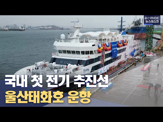 [앵커] 정보통신기술을 총망라한 전기추진 스마트선박이 울산 앞바다에서 운항을 시작했습니다. 매연을 내뿜지 않는 친환경 선박에 정보통신 기술이 접목된 국내 최초의 선박으로 동해안을 누빌 예정입니다. 최지호 기자입니다. [리포트]힘찬 뱃고동 소리를 내며 선체를 드러낸 울산태화호. 무게 2천700톤, 길이 89미터, 폭...