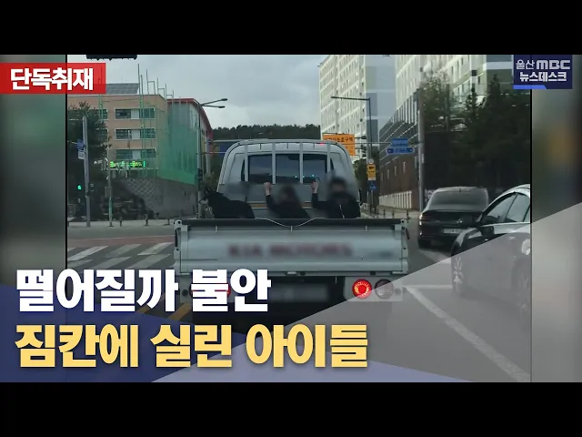 울산시내 도로에서 어린 아이들을 짐칸에 싣고 달리는 화물차가 발견됐습니다. 아이들은 화물차가 달리는 내내 어떠한 안전장치도 없이 차만 꼭 붙잡고 있었습니다. 정인곤 기자가 단독 보도합니다. [리포트] 한 1톤 트럭이 좌회전 신호를 기다리고 있습니다. 그런데 화물 적재함에 어린아이 2명과 개 한 마리가 앉아 있습...