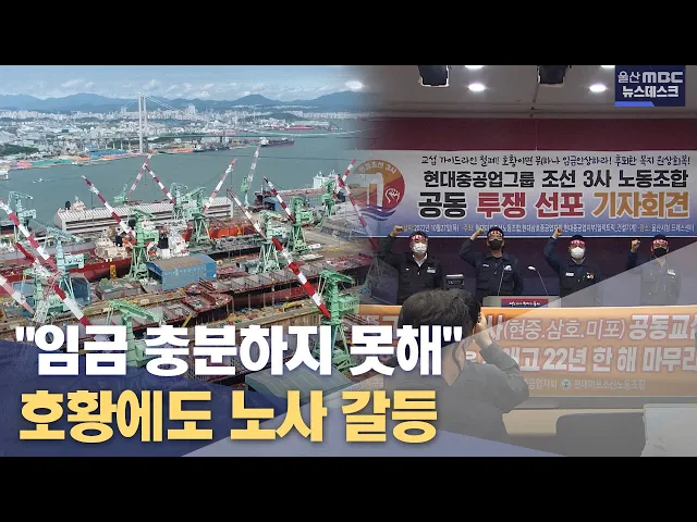 [앵커] 현대중공업과 현대미포조선이 1년 만에 흑자 전환에 성공하며 깜짝 실적을 발표했습니다. 당초 목표를 뛰어넘는 수주 실적 때문인데, 노동조합은 이처럼 일감은 넘쳐나는데 임금을 충분히 올려주지 않는다면 공동 대응하겠다며 반발하고 있습니다. 정인곤 기자입니다. [리포트]현대중공업그룹 중간지주사인 한국조선...