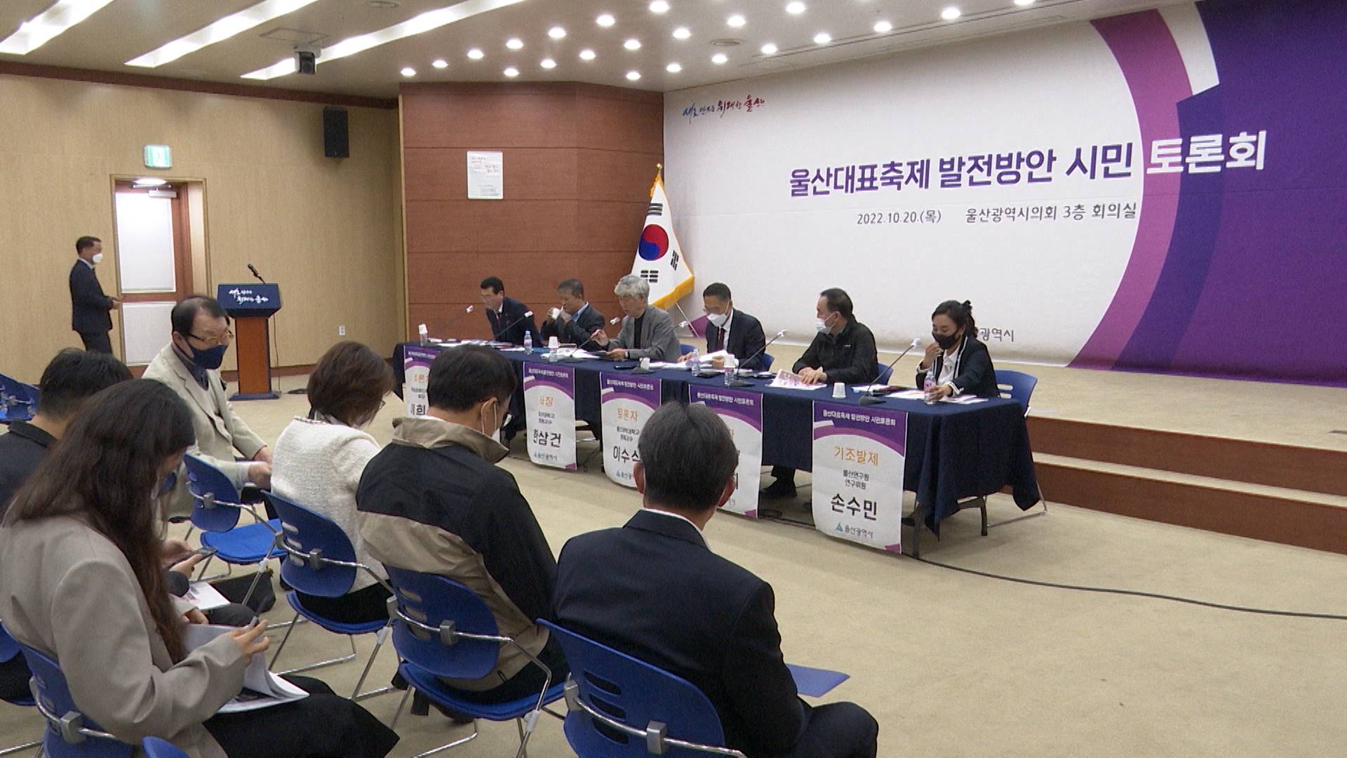 지역 대표축제를 활성화시키기 위한 시민 토론회가 오늘(10/20) 울산시의회 회의실에서 열렸습니다. 한삼건 울산대 명예교수를 좌장으로 학계와 언론, 노동, 예술, 연구단체 종사자들이 참석했습니다. 기조 강연에 나선 울산연구원 손수민 박사는 시민 관심도가 높은 축제 키워드는 고래 축제와 장미 축제라고 설명했습니다...
