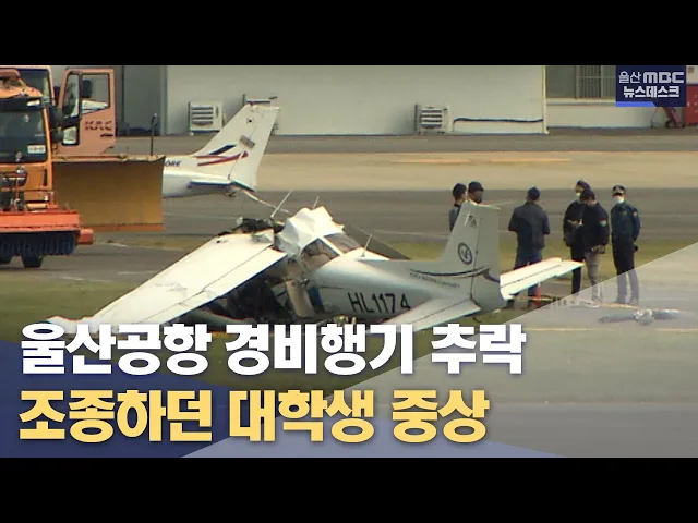 오늘(10/13) 오전 11시 50분쯤 한국항공대 비행교육원 소속 경비행기 1대가 울산공항에 추락했습니다. 이 사고로 조종사 1명이 심정지 상태로 구조돼 병원 치료를 받으며 의식을 회복 중인 것으로 알려졌습니다. 국토교통부 항공사고조사위원회는 착륙을 위한 저고도 비행을 하던 중 사고가 난 것으로 보고 운행 기록을 토...