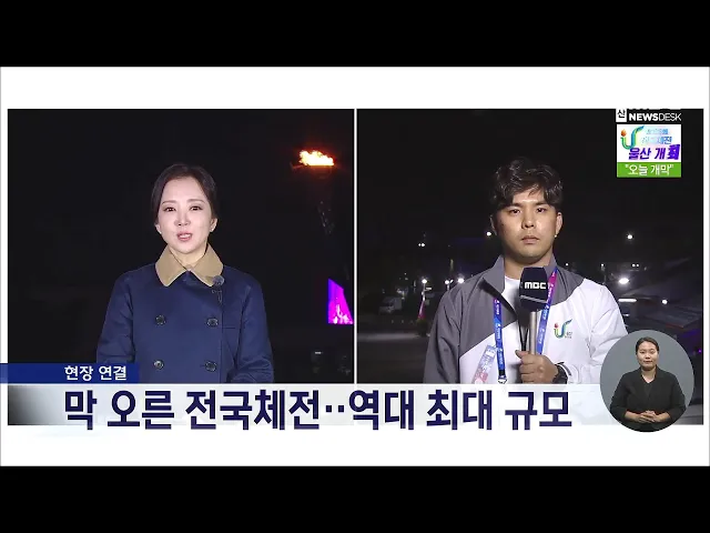 [앵커] 제 103회 울산 전국체전이 오늘 막을 올리며 7일 간의 열전에 돌입했습니다. 오늘(10/7) 울산MBC 뉴스는 체전 개막식이 열리고 있는 울산종합운동장에서 진행됩니다. 이 시각 현재 역대 가장 큰 규모의 개회식이 진행되고 있는데요. 현장에 있는 정인곤 기자 연결해보겠습니다. [기자] 네, 저는 개회식이 열리고 있...