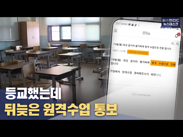 울산시교육청이 태풍에 따른 원격수업 전환을 너무 늦게 결정하면서 오늘(9/19) 교육청과 일선 학교에는 학부모들의 항의 전화가 빗발쳤습니다. 학부모들이 원격수업 전환 통보를 받은 것은 7시50분대로 고등학생들은 이미 학교에 갔다가 돌아온 경우가 많았고 유치원과 초등학교 저학년은 자녀를 맡길 곳을 찾지 못해 애를...