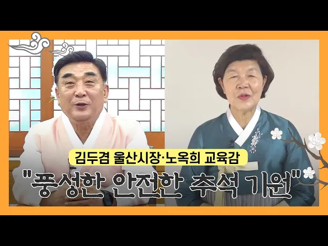 [앵커] 민족의 명절인 추석을 맞아 김두겸 울산시장과 노옥희 교육감이 울산시민들에게 명절 인사를 전했습니다. [인터뷰] 김두겸 / 울산시장 존경하고 사랑하는 울산시민 여러분, 민족의 대명절 추석입니다. 일상을 되찾고 맞이하는 첫 추석인 만큼 오랜만에 고향을 찾는 설렘이 가득한 연휴 되시길 바랍니다. 몸과 마음이...