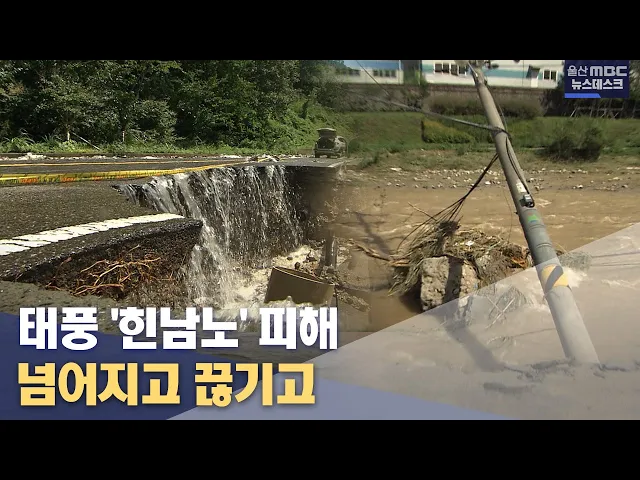 [앵커]울산은 태풍 힌남로가 오늘 아침 관통하면서 곳곳에 적지 않은 피해를 남겼습니다. 나무와 전봇대가 넘어지고 도로와 수도, 전기가 곳곳에서 끊겼습니다. 정인곤 기자입니다. [리포트] 울산 울주군 두동면의 한 강변 도로. 수십미터짜리 전신주 여러개가 힘없이 넘어졌습니다. 도로가 태풍 충격에 부서지면서 땅 속에...