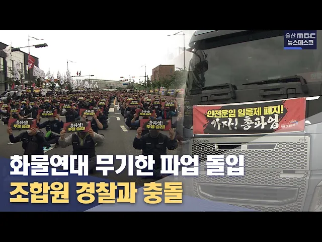 [앵커] 울산에서도 화물연대가 최저운임 계속 보장 등을 요구하며 무기한 전면파업에 돌입한 가운데 화물연대 조합원 4명이 공무집행방해 혐의로 경찰에 연행됐습니다. 파업이 길어질수록 생산 차질이 불가피한 기업체들은 장기화 조짐에 촉각을 곤두세우고 있습니다. 이용주 기자입니다. [리포트] 울산신항 앞 도로. 머리...