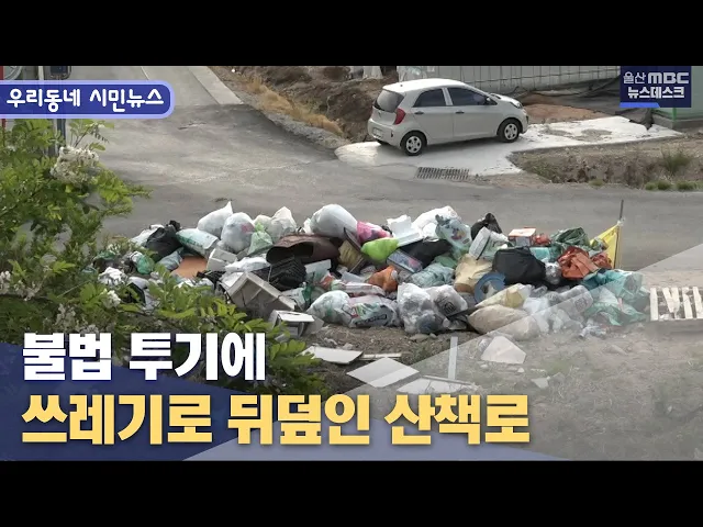 ◀앵커▶ 우리 동네 시민들이 직접 만드는 울산MBC 시민뉴스입니다. 오늘은 주민들이 이용하는 산책로가 불법으로 내다버린 쓰레기 때문에 불편하다는 소식, 김삼숙 시민기자가 전해드립니다.◀리포트▶저는 지금 울산 북구 천곡 제전마을에 나와 있습니다 이곳은 주민들이 많이 이용하는 산책로인데요, 바로 옆에 각종 쓰레기...