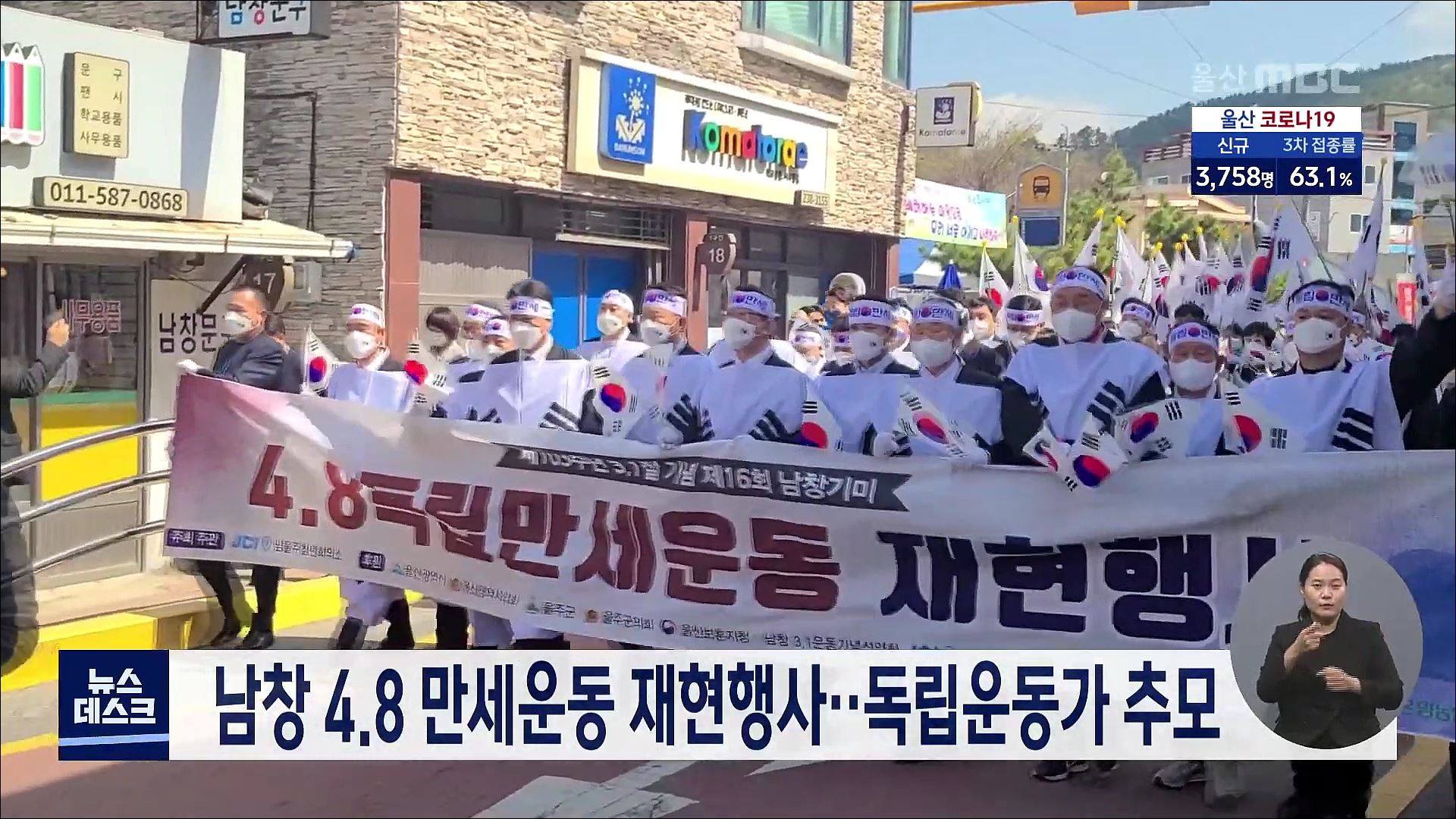 남창 4.8 만세운동을 기념하는 재현 행사가 오늘(4/8) 울주군 남창시장 일대에서 열렸습니다. 남창 4.8 만세운동은 일제 식민지 시기인 1919년 울산에서 일어난 3대 만세운동 중 하나로, 남창 장날에 맞춰 지역 주민들을 중심으로 진행됐습니다. 오늘 행사 참가자들은 독립운동가들을 기리는 분향과 헌화를 진행한 뒤, 남창...