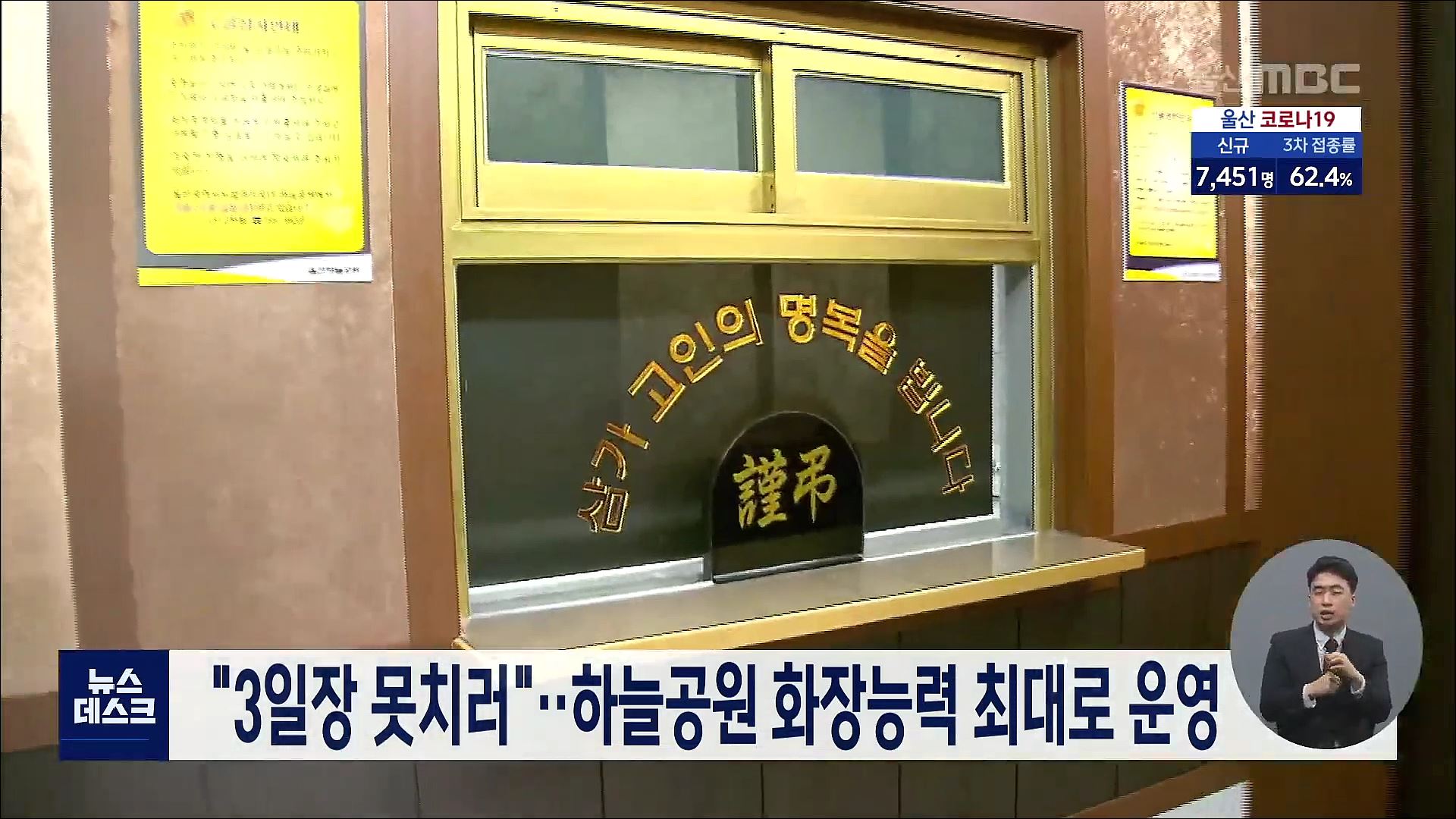 코로나19 등으로 인한 사망자 증가로 3일장을 치르는 것이 어려워지고 있는 상황을 고려해 하늘공원이 화장로 가동을 최대로 확대합니다. 울산시설공단은 부울경 지역의 화장 시설 부족으로 3일 이상 대기하는 사례가 늘고 있어, 오는 27일부터 하늘공원 가용인력을 총동원해 일일 최대 59건의 화장을 운영한다고 밝혔습니...