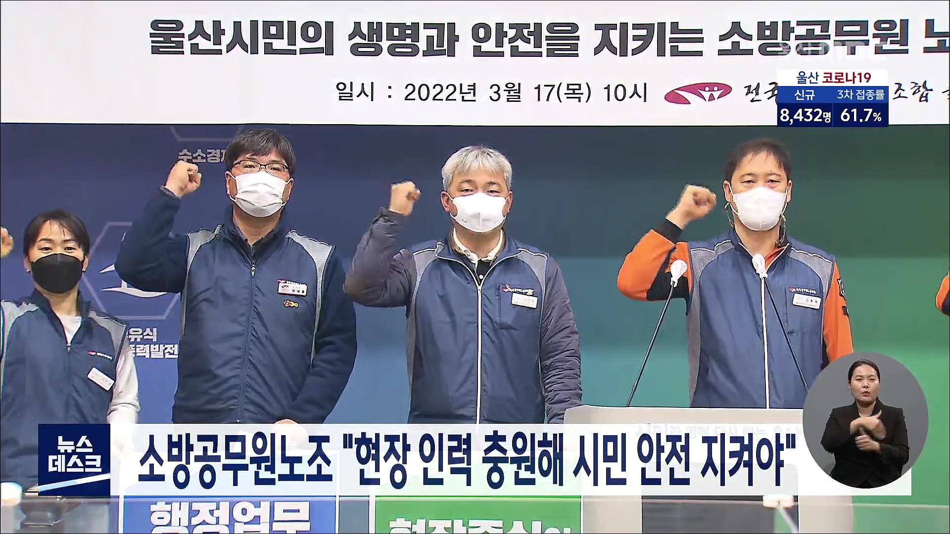 공무원노조 울산소방지부가 2기 출범 기자회견을 열고 소방공무원의 처우 개선을 요구했습니다. 이들은 지역 119안전센터가 만성적인 인력난을 겪고 있어 현장 근무 인원을 충분히 확보하고, 소방공무원의 근무 형태를 3조 1교대 방식으로 개선해 줄 것을 요구했습니다.