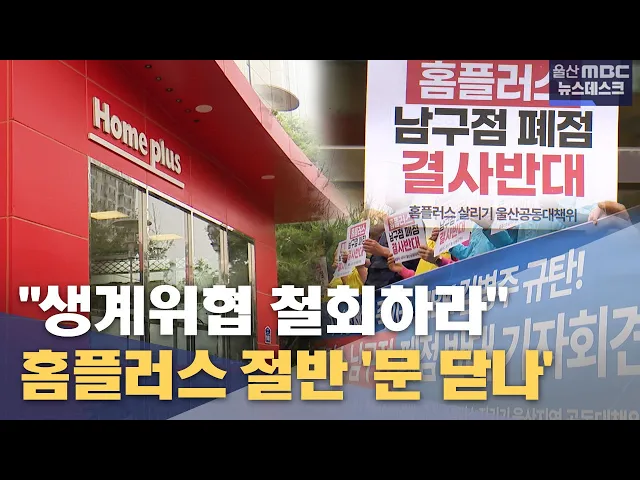 [앵커]회생절차에 들어간 홈플러스가 울산 북구점에 이어 남구점에도 계약 해지를 통보했습니다. 울산지역 4개 매장 가운데 절반이 문을 닫을 위기에 놓인건데, 고용을 보장하겠다는 홈플러스의 입장에도 직원들은 불안을 호소하고 있습니다. 이다은 기자입니다. [리포트]철회하라, 철회하라, 철회하라. 투쟁. 홈플러스 울...