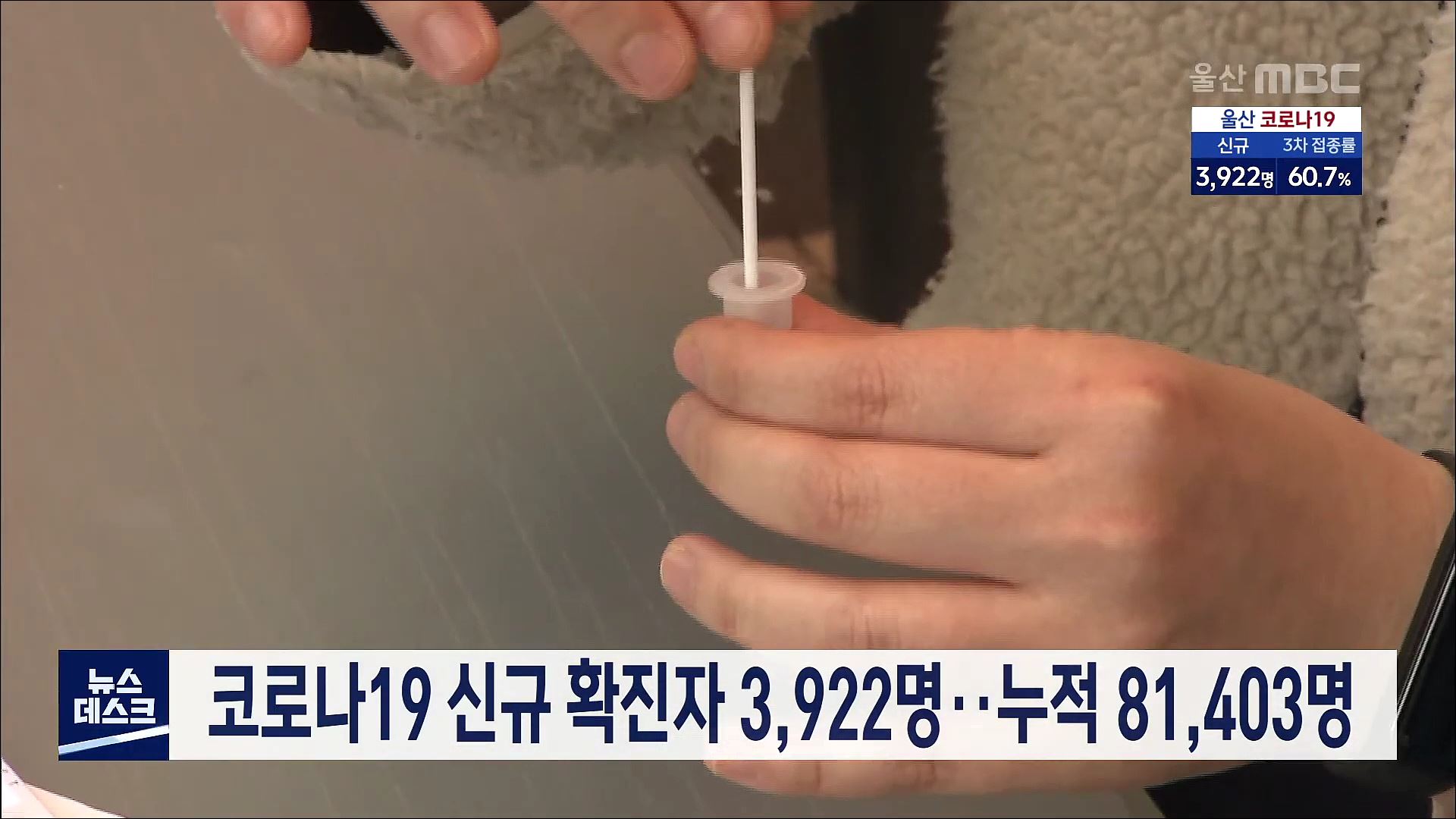 오늘(3/6) 울산에서는 코로나19 신규 확진자가 3천922명이 발생했습니다. 지역별로는 남구가 가장 많았으며 북구와 울주군, 중구, 동구 순이었으며 사망자도 3명이 추가됐습니다. 이로써 울산지역의 누적 확진자는 모두 8만 1천403명으로 늘었습니다.