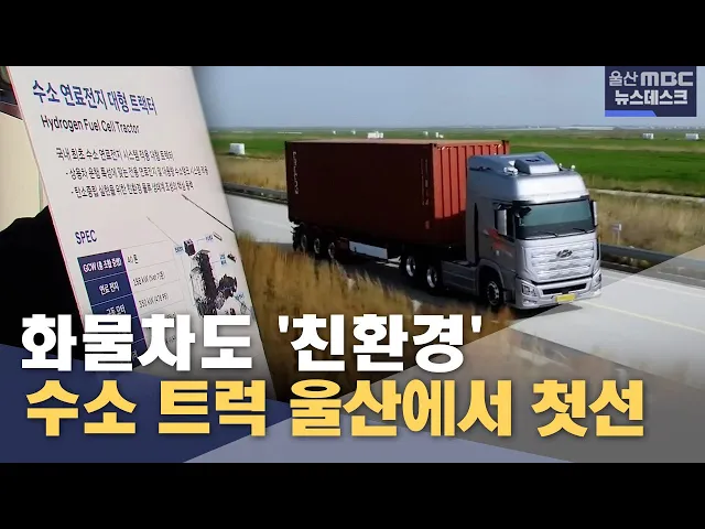 [앵 커]탄소 배출 없이 수소를 연료로 움직이는 대형 트럭이 전국 최초로 울산에서 공개됐습니다.수소 경제를 선도하고 있는 울산이 내연기관 중심의 물류 업계에도 친환경 전환을 앞당길 것으로 기대됩니다.최지호 기자.[리포트]대형 컨테이너를 실은 트레일러가 앞으로 이동합니다.커다란 차체가 움직이는데 소음 대신 인...