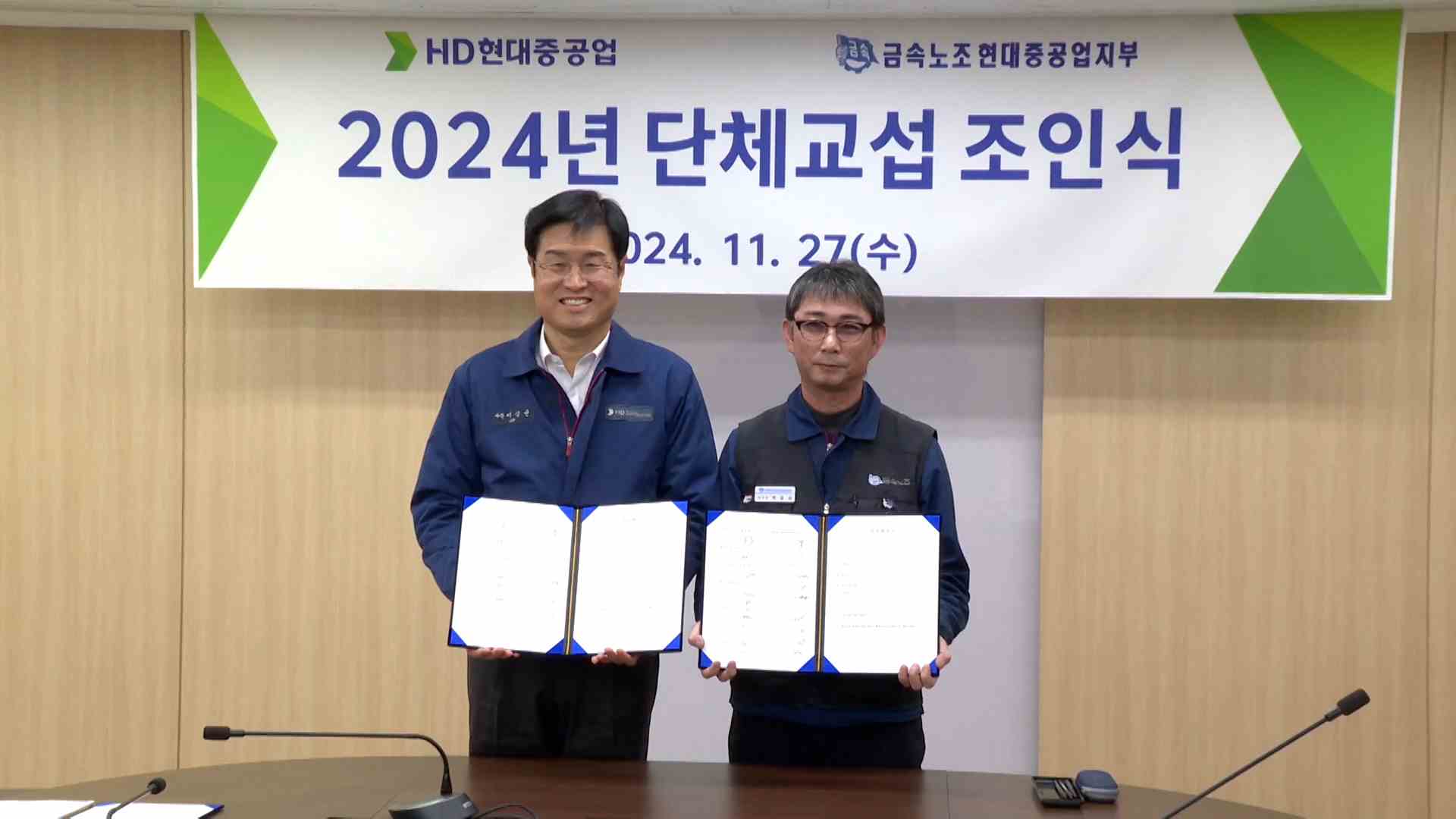 HD 현대중공업 노사가 오늘(11/27) 울산 HD현대중공업에서 2024년 임금과 단체협상 조인식을 가졌습니다. 현대중공업 노사는 24차례 부분파업과 물리적 충돌 등 첨예한 갈등을 빚기도 했지만 3년 연속 연내 임단협 타결에 성공했습니다. 조선업계에서 유일하게 기본급을 13만 원 인상하고 격려금 470만 원 지급에 합의해 평...