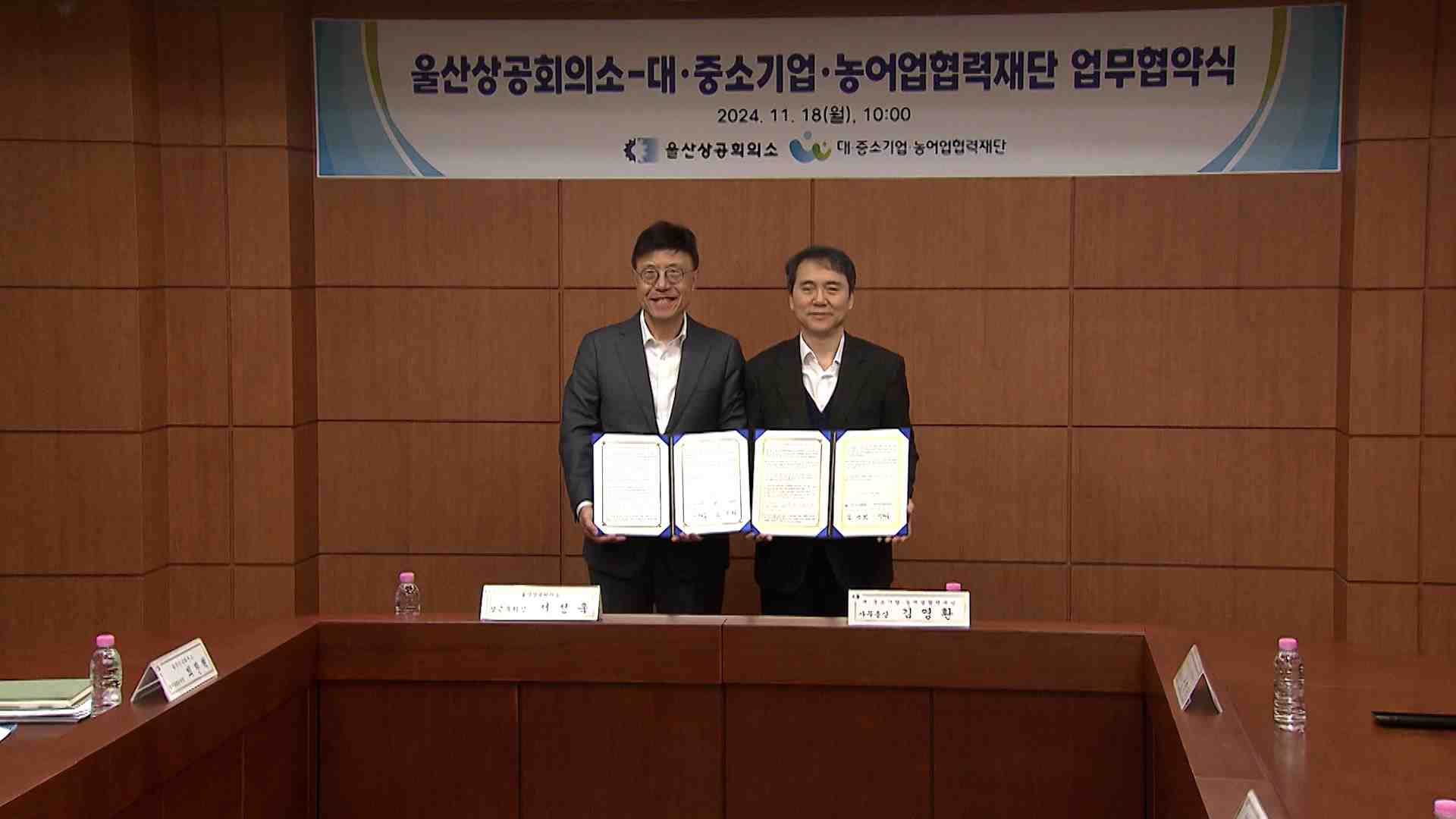 울산상공회의소와 대·중소기업·농어업 협력재단은 오늘(11/18) 상생 협력 확산을 위한 업무협약을 체결했습니다. 두 기관은 이번 협약을 통해 울산지역 동반성장과 상생 협력을 비롯해 기술경쟁력 확보와 판로개척에도 협력하기로 했습니다. 대·중소기업·농어업 협력재단은 중소벤처기업부 산하 단체로 대·중소기업과 농어...