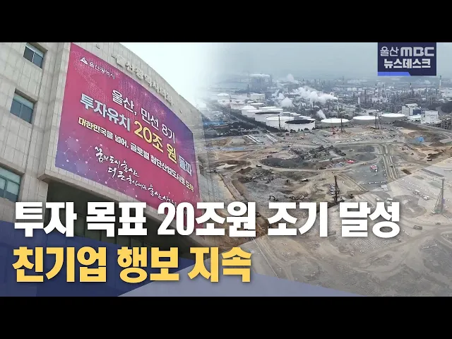 [앵커]민선 8기 울산시가 출범 1년 10개월 만에 20조 원 투자유치 공약을 조기 달성했습니다.기업 현장에 직접 참여하는 적극 행정이 투자 유치로 이어졌다고 판단한 울산시는 지속적인 친기업 행보를 이어갈 계획입니다. 이돈욱 기자입니다. [리포트]최근 울산시는 민선 8기 투자유치 실적이 20조 원을 돌파했다고 발표했...