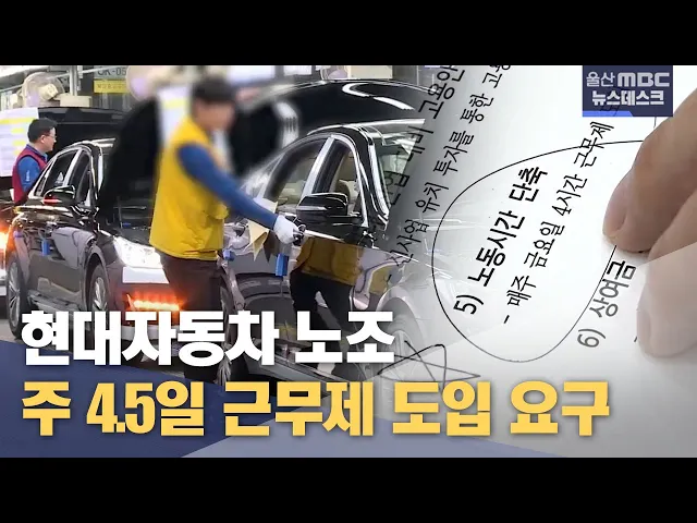 [앵커]현대자동차 노조가 주4.5일 근무제 도입을 요구하고 나섰습니다.20여년전 주5일제 시행에 현대차가 불을 붙였던 걸 감안하면 앞으로 주4.5일제가 노동계와 경제계의 화두가 될 전망입니다. 홍상순 기잡니다. [리포트]현대자동차 노동조합이 임시대의원대회를 열고 2024년 임단협 요구안을 확정했습니다.기본급 15만 9...