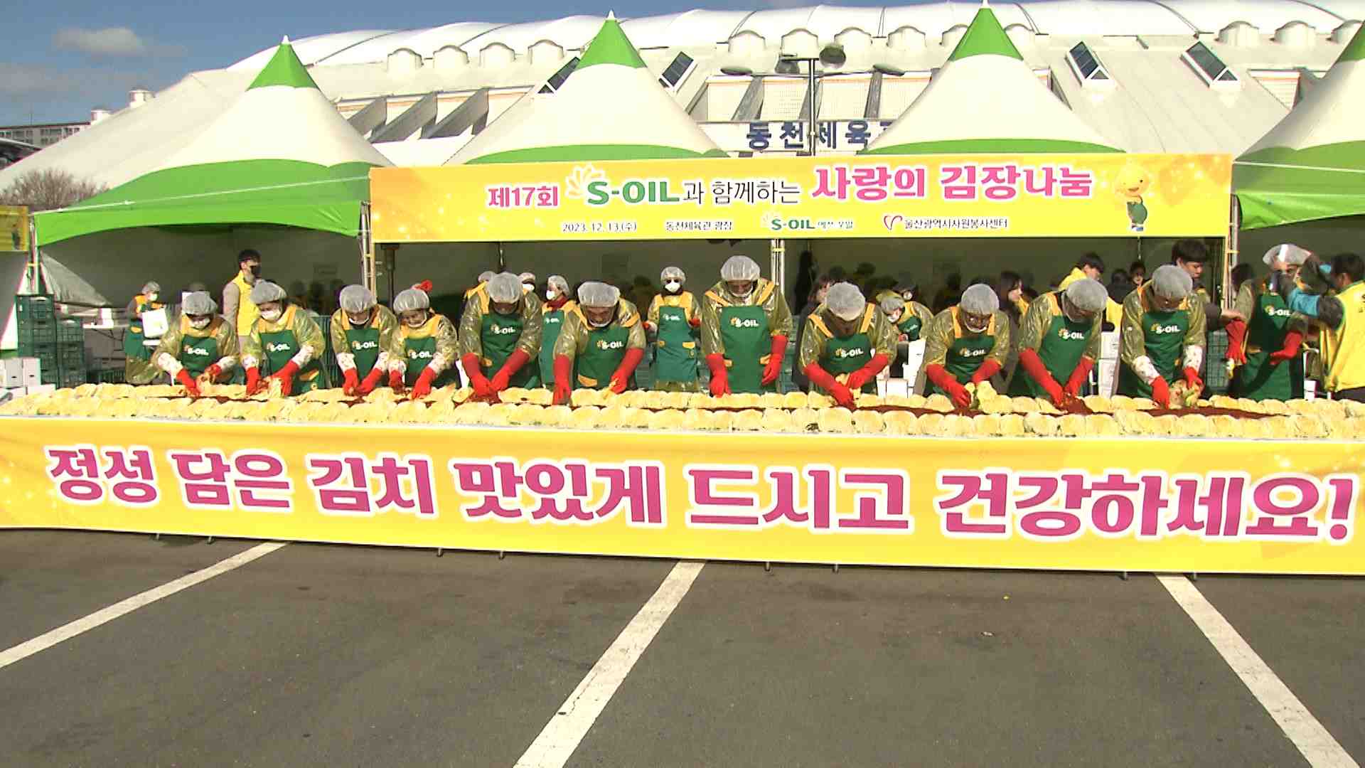에쓰오일과 함께하는 사랑의 김장 나눔 행사가 오늘(12/13) 중구 동천체육관 광장에서 열렸습니다. 회사 임직원 등으로 구성된 자원봉사자 150명은 배추 8천 포기와 무 1만 개로 1억 원 상당의 김장김치를 담갔습니다. 이 김치는 저소득 가정 2천1백 세대에 전달됐습니다.