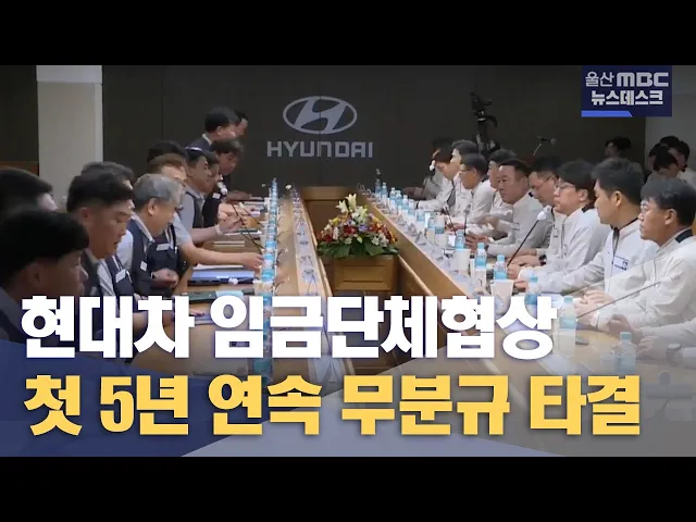 [앵커]현대자동차 노사가 사상 처음으로 5년 연속 파업 없이 단체교섭을 마무리했습니다. 역대 최대 수준인 경영 성과에 따른 보상과 대외 여론 등을 고려한 결과로 분석되는데요. 울산공장이 전기차 생산체제로 전환하는데 있어 탄력을 받을 것으로 전망됩니다. 유희정 기자.[리포트]현대자동차 노사가 석 달만에 올해 임...