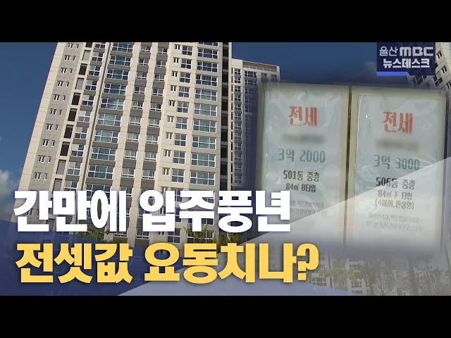 [앵커]이달부터 연말까지 울산지역 입주물량이 5천 가구를 넘으면서 1년여 만에 하락세를 멈춘 전셋값이 다시 요동칠 수 있다는 우려가 나오고 있습니다.통상 입주가 진행되는 동안 인근 아파트 전셋값이 떨어지는 경우가 많았는데, 실제 울산 중구와 남구를 중심으로 전셋값이 소폭 하락하는 추세를 보이고 있습니다.이상...